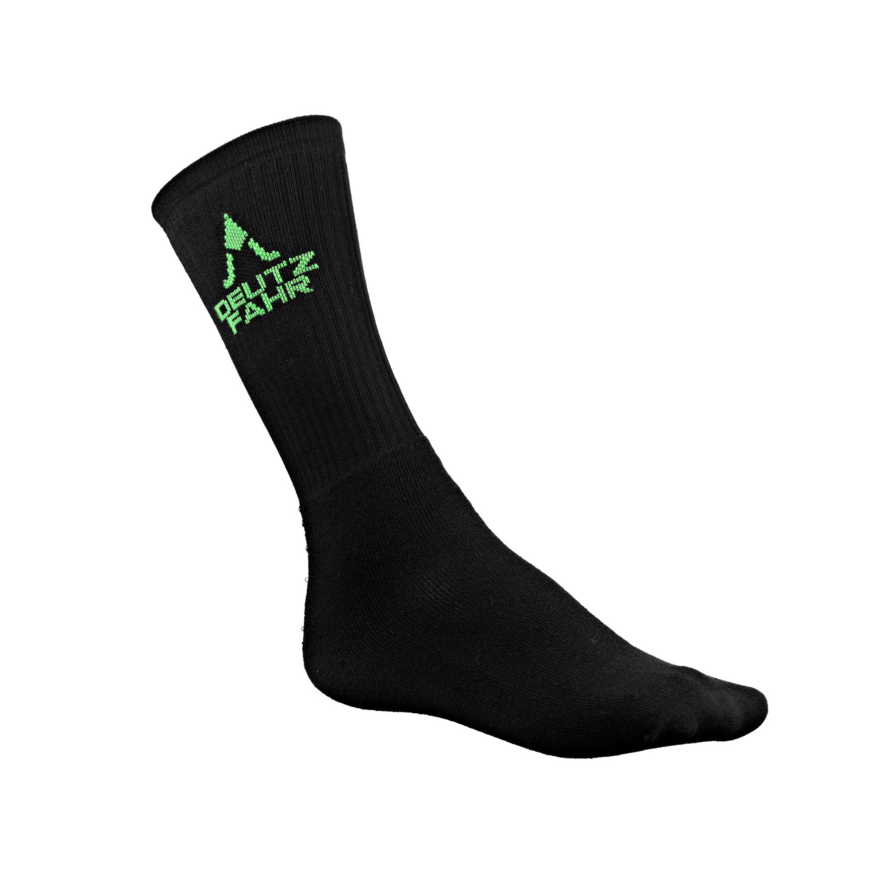 Chaussettes tubulaires courtes en tissu éponge noir avec logo DEUTZ-FAHR vert. Taille unique. Emballés dans des sacs en polyéthylène.