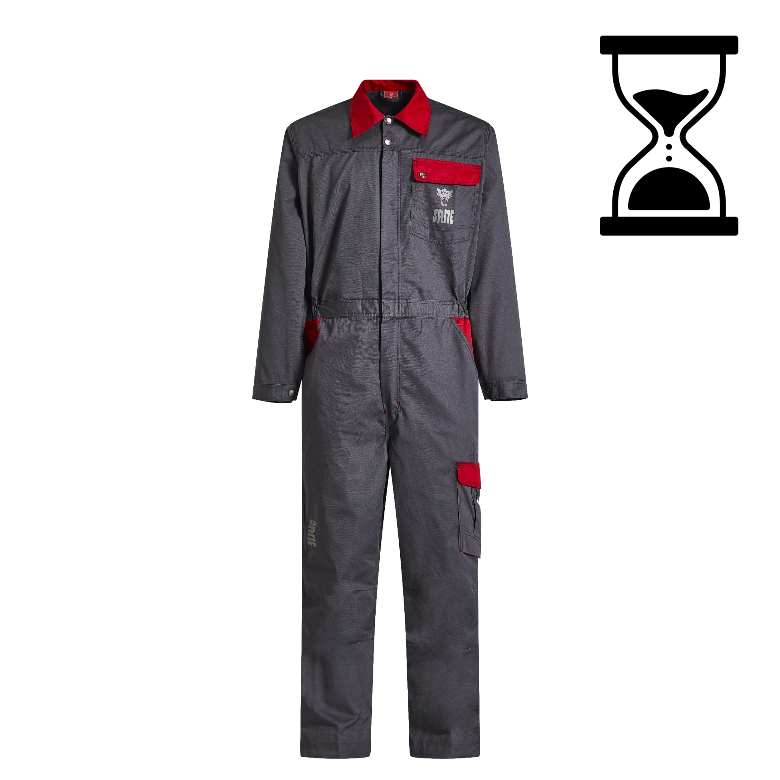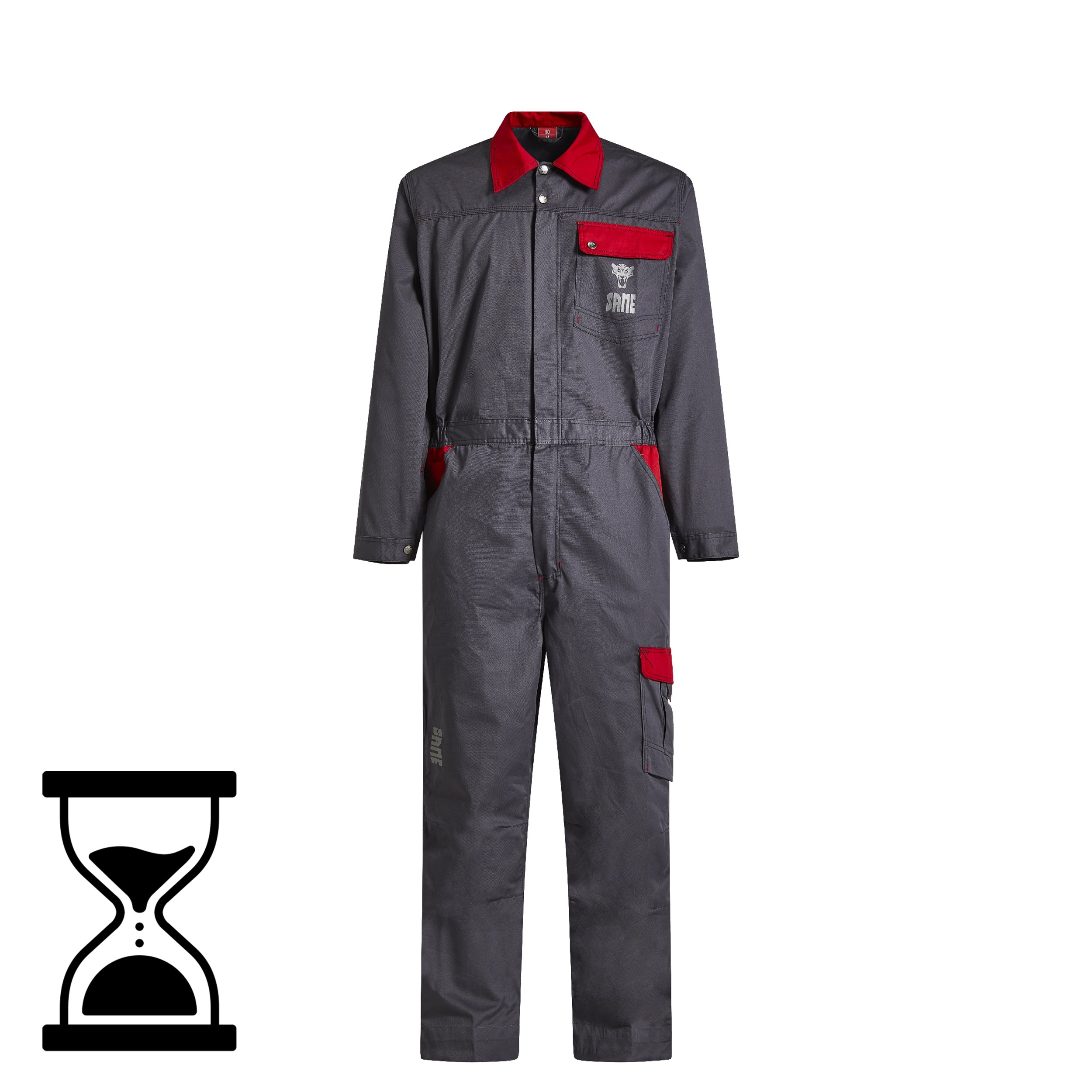Combinaison de travail avec col chemise en tissu de coton sergé solide et durable, 240 g/m². Impression du logo SAME en matériau réfléchissant à l'avant et à l'arrière de la combinaison, genoux ergonomiques, ourlets extensibles, nombreuses poches aux fonctions diverses et divers détails rouges contrastés.