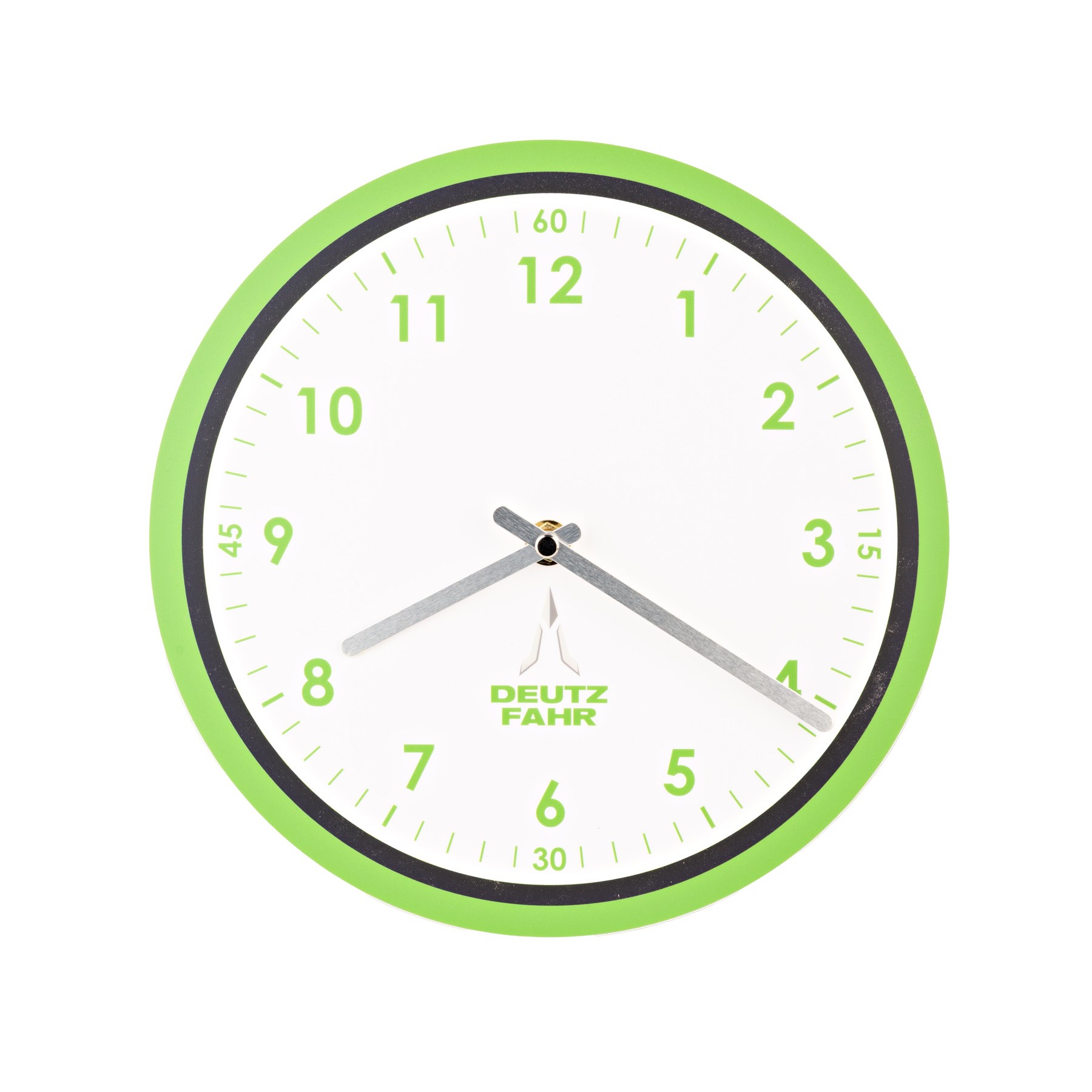 Okrągły zegar ścienny DEUTZ-FAHR z czarnymi wskazówkami. Spersonalizowany w typowych dla marki kolorach. Dostarczany bez baterii.