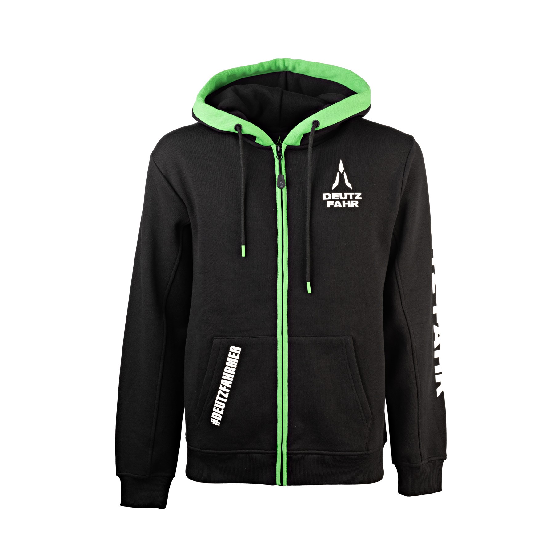 Le sweat à capuche pour femme #DEUTZFAHRMER est en tissu mixte de coton (80 %)   et de polyester (20 %) de 350 g/m², ce qui lui assure une grande durabilité. L'intérieur brossé et les deux poches kangourou à l'avant en font un vêtement particulièrement confortable et chaud. L'ajout de quelques détails verts, tels que le bord de la capuche, les embouts de la coulisse de la capuche et la fermeture éclair sur le devant, égayent ce vêtement et lui confèrent un style sportif. Ce vêtement se distingue par l'inscription #DEUTZFAHRMER imprimée en blanc sur le bord de la poche droite, la grande inscription DEUTZ-FAHR imprimée en blanc sur toute la longueur de la manche gauche, le logo complet DEUTZ-FAHR imprimé à la fois sur la poitrine, côté cœur, et dans le dos, en bas à droite, ainsi que les tirettes de fermeture éclair personnalisées.