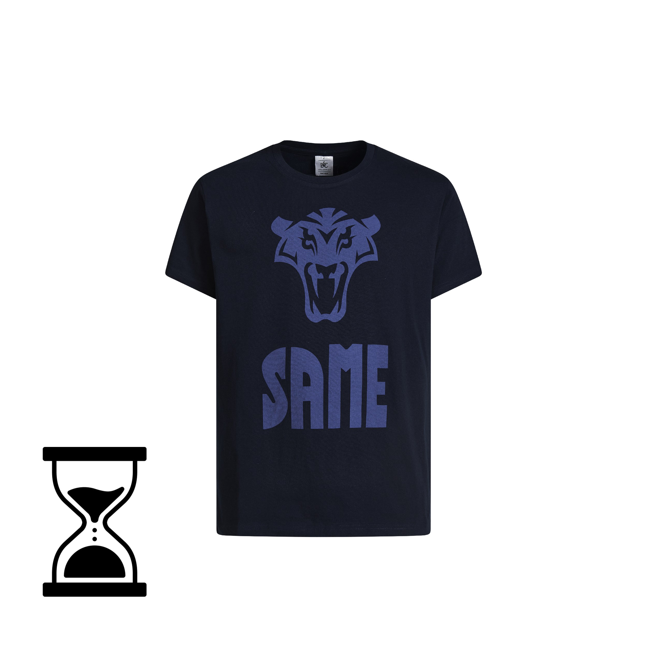 Le T-shirt bleu marine SAME à col rond est fabriqué en 100 % coton filé à l'anneau avec un poids de 185 g/m² pour garantir la qualité et la durabilité. Les manches sont courtes, l'encolure est en côtes 1x1 avec élasthanne et la structure du buste est tubulaire, sans coutures latérales, pour un meilleur confort. L'impression ton sur ton du logo SAME sur le devant confère au vêtement un style original et distinctif.